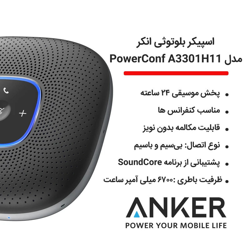 اسپیکر کنفرانس بلوتوثی Anker PowerConf A3301H11 یک دستگاه حرفهای و جمعوجور است که برای جلسات آنلاین، تماسهای کنفرانسی، کلاسهای مجازی و محیطهای کاری طراحی شده است. این اسپیکر با ویژگیهای منحصر به فرد خود، تجربهای بینظیر از مکالمات صوتی با کیفیت بالا را ارائه میدهد.