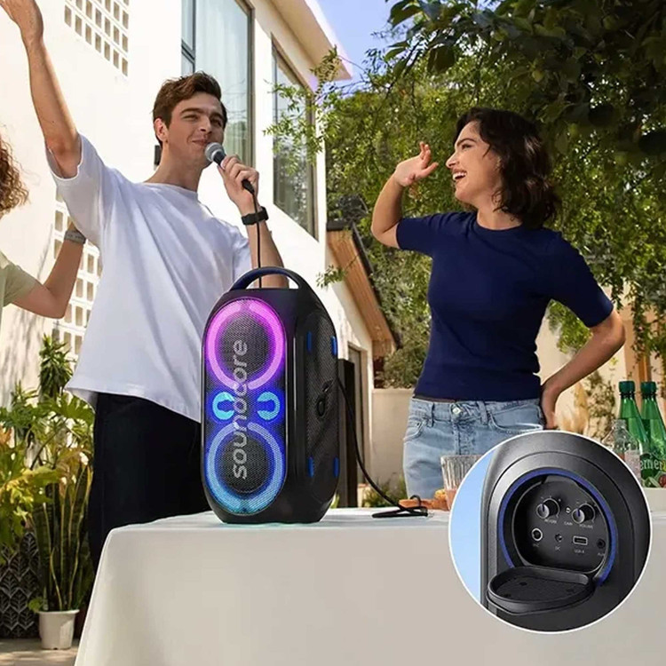 5. تنظیم نورپردازی با استفاده از دکمههای موجود روی اسپیکر یا اپلیکیشن Soundcore، افکتهای نورپردازی را تغییر دهید.