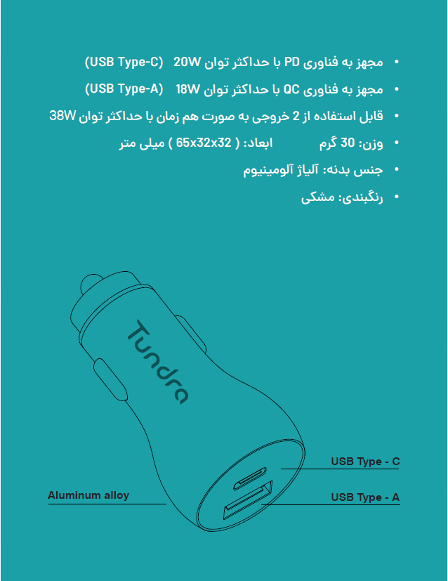 شارژر فندکی تاندرا مدل T30-38WPD یک شارژر دو پورت پیشرفته است که برای استفاده در خودرو طراحی شده و امکان شارژ همزمان دو دستگاه را فراهم میکند. این محصول با توان خروجی ۳۸ وات و پشتیبانی از فناوریهای شارژ سریع Power Delivery (PD) و Quick Charge (QC) مناسب انواع گوشیهای هوشمند، تبلتها و دستگاههای مجهز به پورتهای USB-C و USB-A است. طراحی فشرده و سبک این شارژر، همراه با بدنه مقاوم از آلیاژ آلومینیوم، آن را به گزینهای ایدهآل برای استفاده روزمره در خودرو تبدیل کرده است. همچنین استانداردهای ایمنی CE، FCC و RoHS تضمینکننده کیفیت و امنیت استفاده از این محصول هستند.