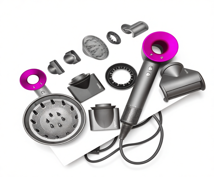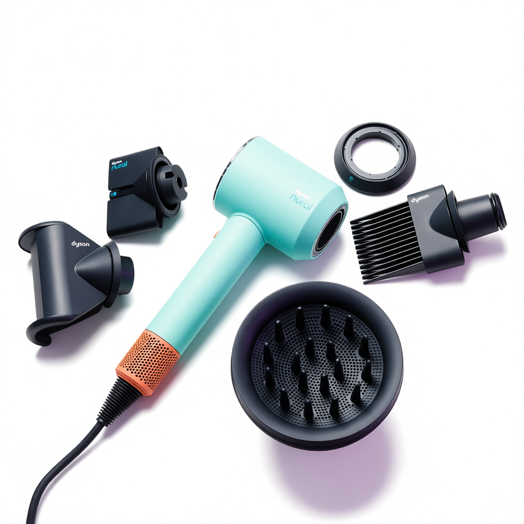 Dyson HD08 دارای مجموعهای کامل از نازلها و سریهای مغناطیسی است که بهصورت چرخشی و بدون فشار به بدنه متصل میشوند: