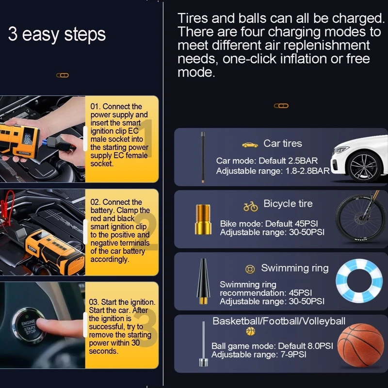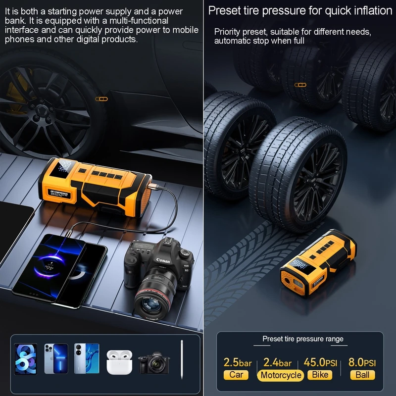 1. طراحی سه در یک: دستگاه پمپ هوا یکپارچه منبع تغذیه اضطراری خودرو، استارت اضطراری خودرو و کمپرسور هوا و پاوربانک را در یک دستگاه جمع و جور ترکیب می کند و راحتی زیادی را برای علاقه مندان به تعمیر و نگهداری خودرو فراهم می کند.