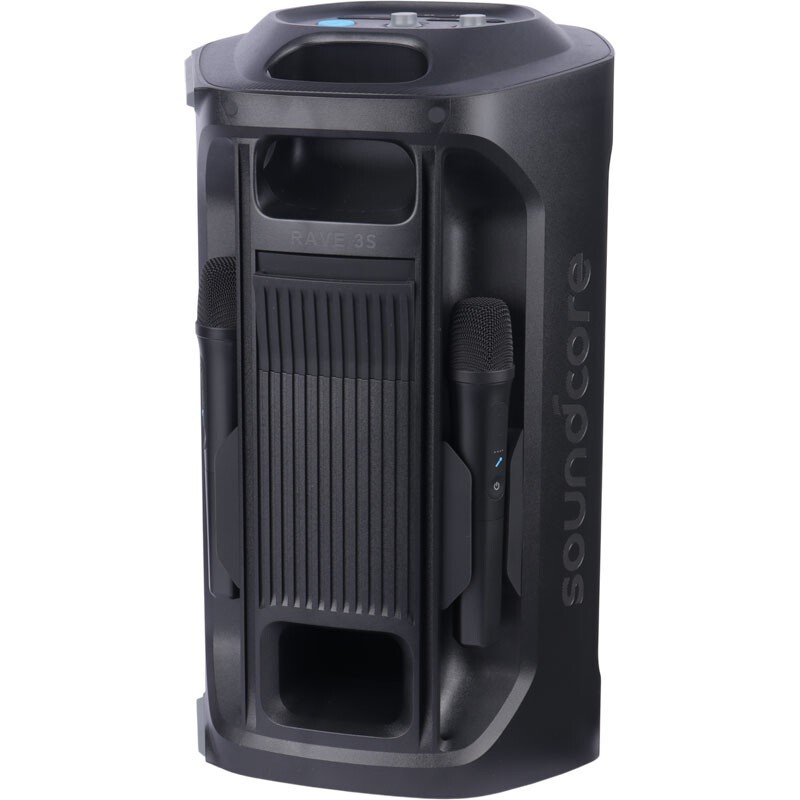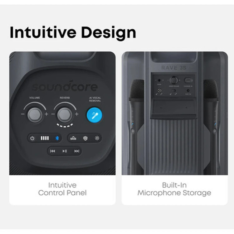 یکی از نقاط قوت اصلی Soundcore Rave 3S قابلیت کارائوکه AI است. این اسپیکر با استفاده از هوش مصنوعی میتواند صدای خواننده را از آهنگ حذف کند و آن را به یک ترک مناسب کارائوکه تبدیل کند. وجود دو میکروفون بیسیم داخل جعبه، افکت ریورب و تنظیمات صوتی مخصوص آواز، این مدل را به گزینهای عالی برای اجرای زنده، دورهمیهای خانوادگی و جشنها تبدیل کرده است. همچنین ورودی 6.35 میلیمتری امکان اتصال میکروفون یا گیتار باسیم را هم فراهم میکند.