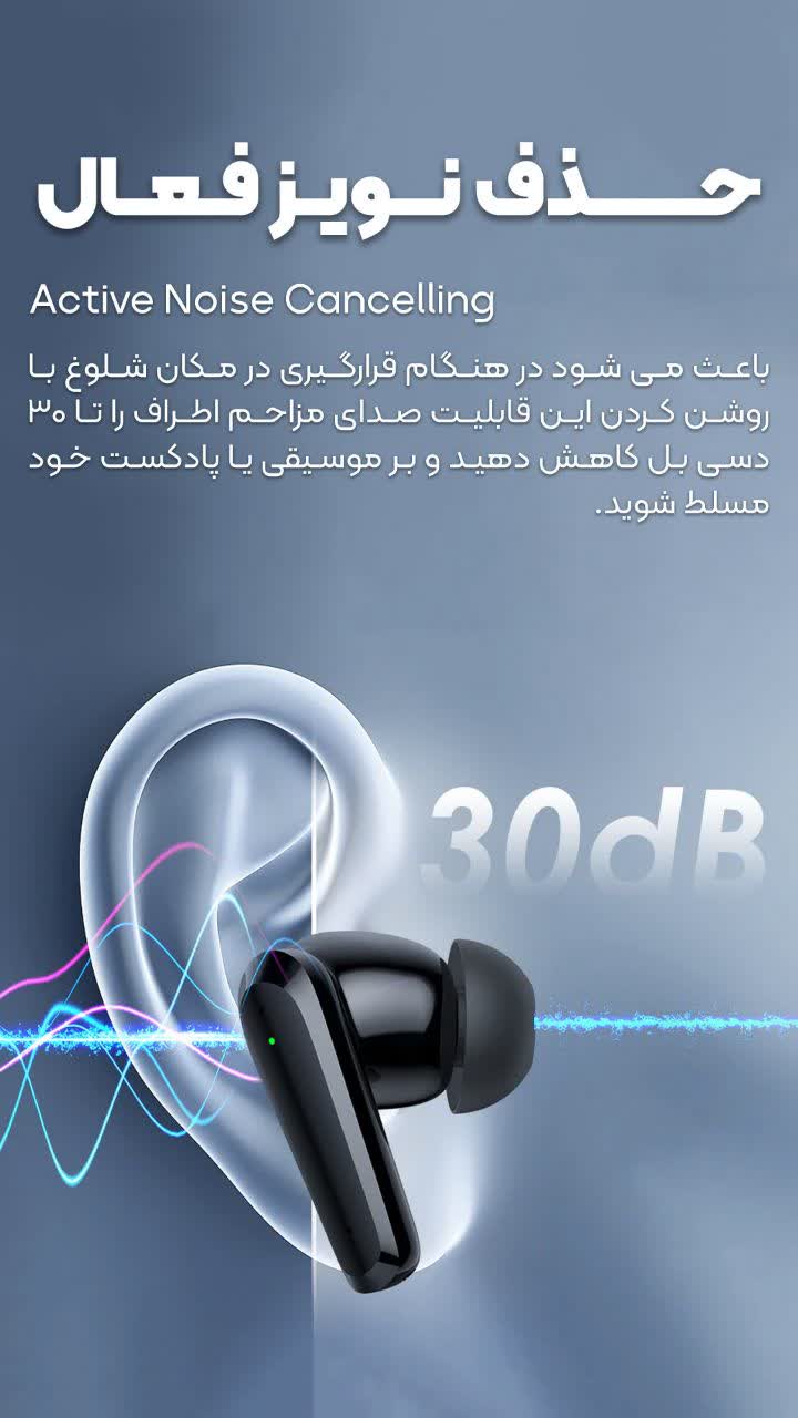مجهز به فناوری ANC (Active Noise Cancellation) با قدرت حذف نویز تا حدود ۳۰ دسیبل. این قابلیت، صداهای مزاحم محیط مانند صدای مترو، خیابان یا محل کار شلوغ را بهطور قابل توجهی کاهش میدهد.