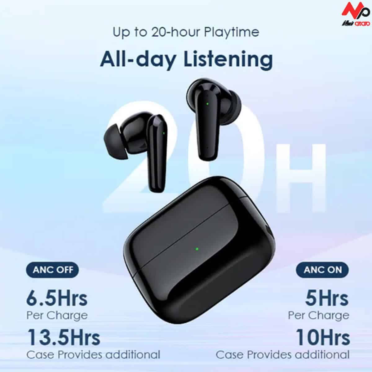 با ANC خاموش: تا ۶٫۵ ساعت با یک بار شارژ (و مجموعاً تا ۲۰ ساعت با کمک کیس شارژ).
